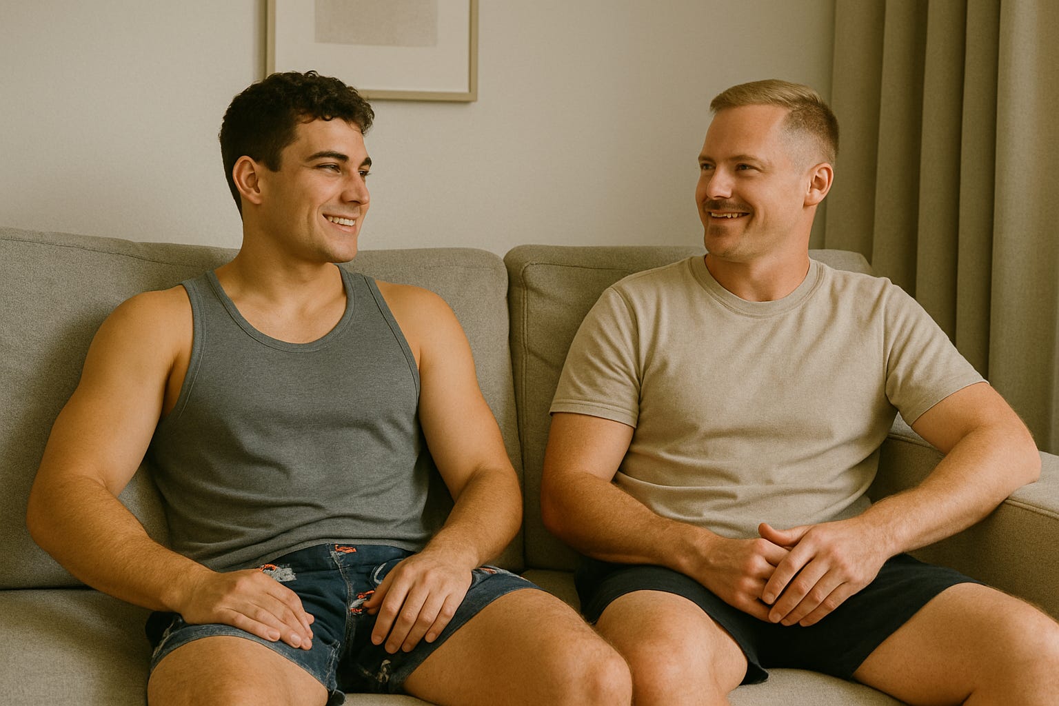 My jaw dropped at the sight that met me - as Max and I entered, another guy, about Max’s age stood in the room - he was a little taller than Max, whith a handsome chiseled face, wavy black hair, and a broad athletic chest dusted with dark hair. I assumed he was in on everything as he was already naked and suggestively stroking his very impressive dick. Max stood next to him, stripping his shorts - priming his own member alongside this other hot young stud.